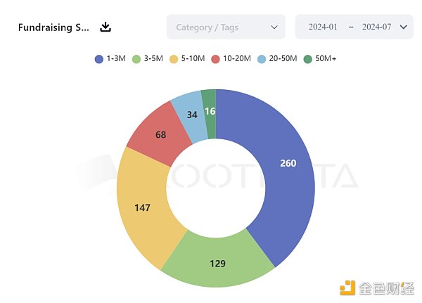 單筆融資規(guī)模: 100~300萬規(guī)模占比40%為最高, 500~1000萬占比22%次之。300~500萬規(guī)模融資相比2023年有所減少,減少的部分增加在100~ 300萬以及500-1000萬區(qū)間,也代表2024項目融得金額中間地帶減少,較為分化。