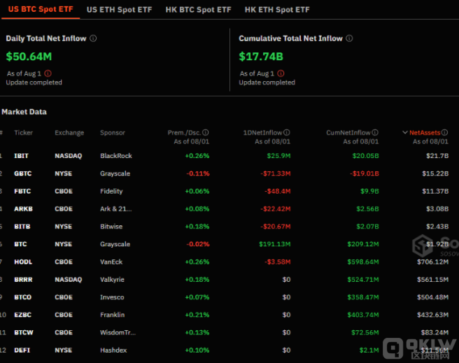 在8月1日,Bitcoin現貨ETF迎來了巨額凈流入,達到5000萬美元,這一現象主要歸功于灰度迷你基金BTC的上市;叶让阅阈磐蠦TC在上市首日凈流入1800萬美元,次日(8月1日)大幅上升至1.91億美元。