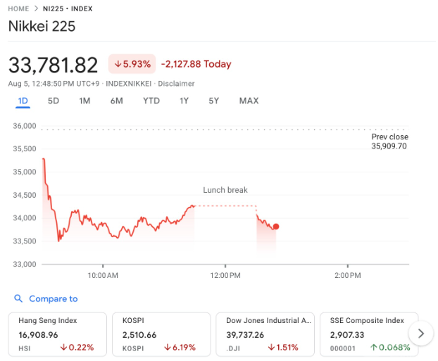 此次早盤下跌是自4月13日以來的最大單日跌幅,原因是投資者對美國和海外主要科技股失去信心,導致大盤和日本股市大幅下跌。To提到,“6月份美國失業率從4.1%上升至4.3%,引發了人們對勞動力市場放緩的擔憂,這種焦慮似乎隨著日經225指數而蔓延。”