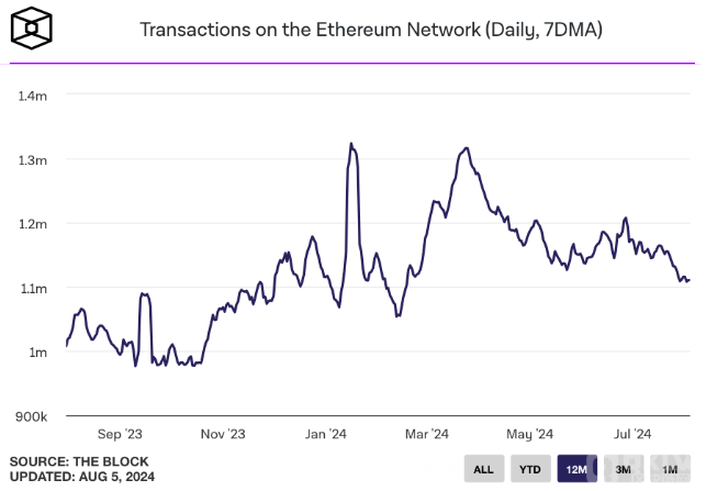 Ethereum網(wǎng)絡(luò)近期經(jīng)歷了一段運營停滯期,其交易量降至五個月來的最低水平。據(jù)統(tǒng)計,7日移動平均線上的交易筆數(shù)穩(wěn)定在每天112萬筆,這是自今年2月以來的最低水平。同時,活躍錢包地址數(shù)量也大幅減少,降至40萬個左右。