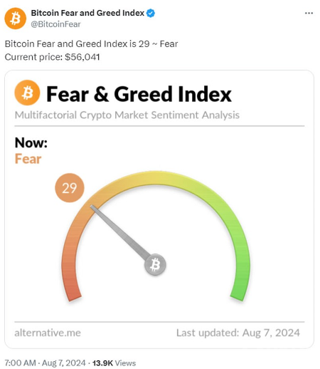 7月末,Bitcoin市場經歷了劇烈波動,自8月5日市場崩盤以來,Bitcoin價格一度跌至49,800美元,但隨后回升了14%,于8月6日重回57,000美元。同時,Bitcoin的恐懼與貪婪指數從“極度恐懼”上升至29,盡管仍處于“恐懼”區間,但市場情緒已有所改善。