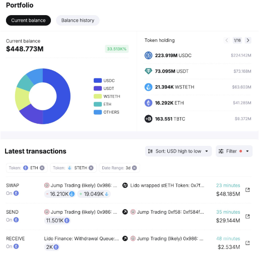 另外,鏈上數(shù)據(jù)門戶網(wǎng)站EmberCN進(jìn)一步披露了Jump Trading的其他相關(guān)活動(dòng)。他們轉(zhuǎn)移了11,500ETH(約2890萬(wàn)美元)到銷售地址,并繼續(xù)將19,049stETH兌換成ETH。同時(shí),該公司還將16,210wstETH(約4792萬(wàn)美元)從存儲(chǔ)地址轉(zhuǎn)移至負(fù)責(zé)提取和兌換ETH的地址,繼續(xù)申請(qǐng)贖回。當(dāng)前,wstETH存儲(chǔ)地址仍有21,394個(gè)wstETH(約6333萬(wàn)美元)待贖回和轉(zhuǎn)移。