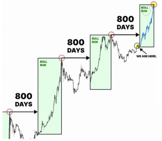 根據 Sensei 的分析,Bitcoin的分形模式顯示,拋物線階段即將到來。技術交易者利用這些模式來識別關鍵的支撐位和阻力位,從而預測價格趨勢的反轉。