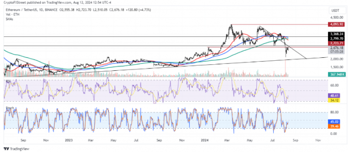 在技術層面,ETH正試圖突破2723美元的阻力位,但上周兩次未能成功突破。相對強弱指數(RSI)處于41以上,顯示出潛在的看漲動能。隨機震蕩指標(Stoch)也顯示出買方勢頭增強。