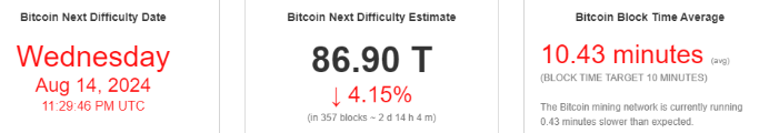 Mining哈希率的持續(xù)下降將導(dǎo)致BitcoinBlockchain在下一次預(yù)定的難度調(diào)整中出現(xiàn)負(fù)面變化。Bitcoin網(wǎng)絡(luò)通過調(diào)整Mining難度來控制礦工的出塊速度,以確保每10分鐘產(chǎn)生一個新區(qū)塊。由于哈希率降低,網(wǎng)絡(luò)將難度減少超過4%,以減輕礦工的工作負(fù)擔(dān)。