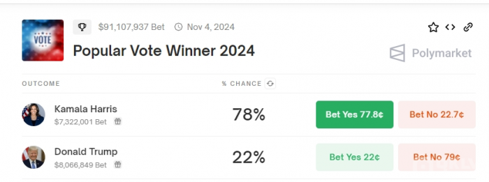 此外,在2024年民調(diào)(Popular Vote Winner 2024)中的預(yù)測(cè)顯示,哈里斯最終勝選的概率更是高達(dá) 78%,而特朗普只有 22%。