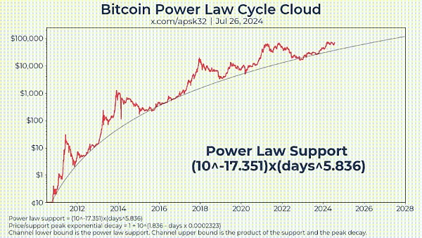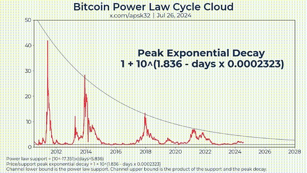 這就是一個簡版對數(shù)模型的分析。網(wǎng)友在給這個圖標(biāo)注了冪律模型,這其實是不對的,冪律模型是對Bitcoin價格以及時間進(jìn)行雙對數(shù)處理,單一對數(shù)處理是對數(shù)增長模型。