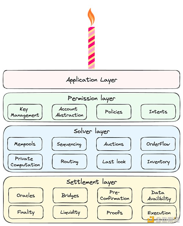 市場上關(guān)于鏈抽象的架構(gòu)分類眾多,比較知名的有FrontierResearch開發(fā)的CAKE框架(ChainAbstractionKeyElements)。這個框架結(jié)合了意圖架構(gòu),將構(gòu)成鏈抽象的各種技術(shù)和解決方案劃分為權(quán)限層、求解層和結(jié)算層。也有其他框架在此基礎(chǔ)上做出微調(diào),如Everclear在求解層和結(jié)算層之間加入了一層清算功能。