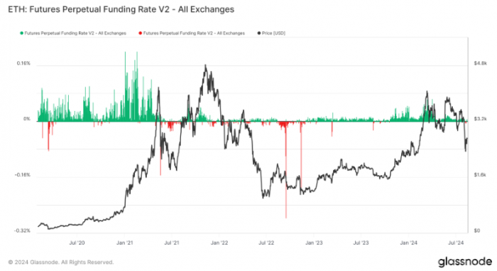 過去幾年,Ethereum的融資利率經歷了顯著波動,這與市場整體情緒密切相關。在2021年的牛市中,融資利率飆升,顯示出多頭頭寸的主導地位。而在市場低迷的2022年和2023年,融資利率轉為負值,反映出交易者對價格下跌的預期。