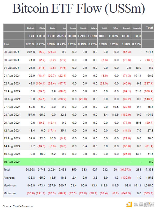 相反,市場(chǎng)現(xiàn)在更加關(guān)注勞動(dòng)力市場(chǎng)和消費(fèi)者健康狀況。因此,周四好于預(yù)期的零售銷售報(bào)告(以及零售巨頭沃爾瑪同時(shí)發(fā)布的強(qiáng)勁收益)緩解了對(duì)經(jīng)濟(jì)即將放緩的擔(dān)憂,并大幅減少了今年美聯(lián)儲(chǔ)預(yù)計(jì)的降息幅度,降至不到100個(gè)基點(diǎn)(或1%)。在其他條件不變的情況下,這些發(fā)展應(yīng)該對(duì)Bitcoin和Ethereum等風(fēng)險(xiǎn)資產(chǎn)構(gòu)成支持,但上周的價(jià)格明顯讓看漲者失望(詳情見下文)。4、情緒和資金流向