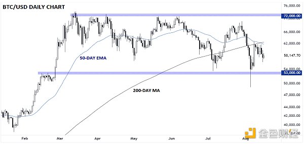 與此同時(shí),Ethereum交易平臺(tái)交易基金(尤其是高費(fèi)用的傳統(tǒng)灰度產(chǎn)品(ETHE))的資金流出開始略有減緩。這些資金流出僅在短短3周內(nèi)就已經(jīng)達(dá)到基金總額近30%,可能會(huì)在接下來的幾周繼續(xù),直到根據(jù)其費(fèi)率結(jié)構(gòu)達(dá)到更適當(dāng)?shù)馁Y產(chǎn)水平。5、Bitcoin技術(shù)分析:BTC/USD日線圖
