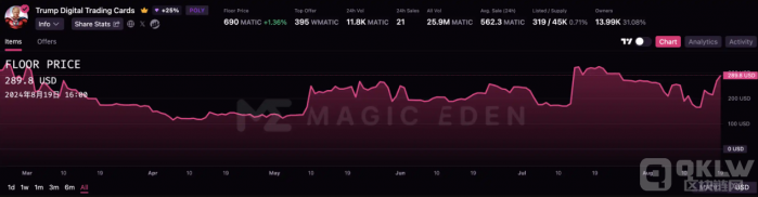 根據OpenSea的數據,從總交易量來看,特朗普的前兩個NFT系列更受歡迎,交易量分別為15,812 ETH和22,080 ETH。鑒于所有銷售均需向創作者收取10%的版稅,自啟動以來,第一個系列NFT的銷售額達到1900萬美元,扣除OpenSea 2.5%的費用后,特朗普賺取了約142.5萬美元。