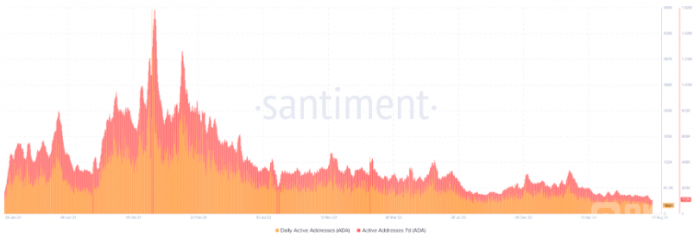 ADA的365天休眠流通指數(shù)也創(chuàng)下了自2022年以來的最高水平,達(dá)到7.1912億ADA。這一現(xiàn)象通常意味著長期持有者可能會(huì)拋售其Tokens,從而對(duì)價(jià)格造成下行壓力。與此同時(shí),ADA的每日和每周活躍地址數(shù)量已降至2020年以來的最低水平,分別為19,669和112,250。