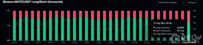CoinGlass的數據顯示,Polygon期貨的未平倉合約也在不斷增加,OI從周一的1.1474億美元上升至周四的2.0939億美元,達到了6月中旬以來的最高水平。這表明市場資金流入積極,新的購買活動正在推動價格上漲。