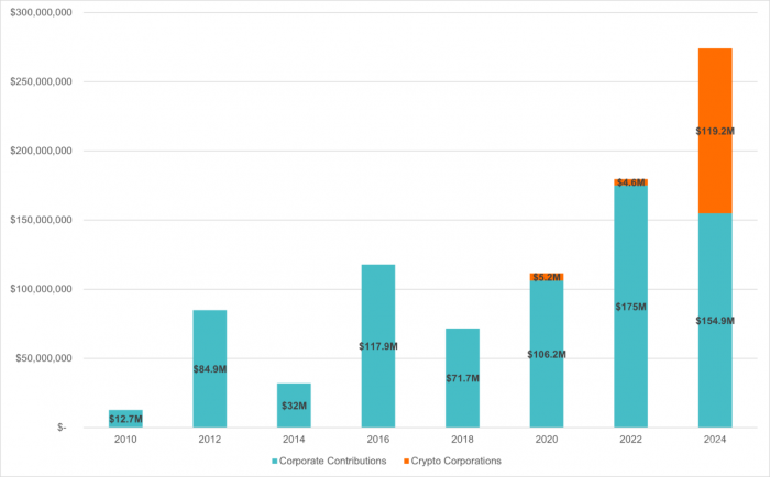 根據(jù)公共監(jiān)督組織Public Citizen的最新報告,2024年選舉周期中,近一半的企業(yè)政治捐款來自crypto公司。這種前所未有的政治支出規(guī)模,僅次于自2010年以來化石燃料行業(yè)的捐款。主要加密公司(如Coinbase和Ripple)已經(jīng)向2024年大選投入了超過1.19億美元,用于支持那些對crypto持有友好態(tài)度的候選人,并抵制那些持懷疑態(tài)度的政治人物。