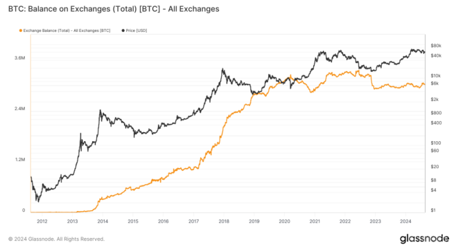歷史數據顯示,交易所的Bitcoin余額可以有效反映市場情緒。2012年至2020年間,交易所持有的Bitcoin數量持續增加,顯示出Bitcoin供應量的不斷增長。自2020年以來,市場走勢出現了較大波動,經歷了吸籌與派發的階段。最近三年,Bitcoin余額的下降顯現出交易所對持有Bitcoin的態度變得更加謹慎。