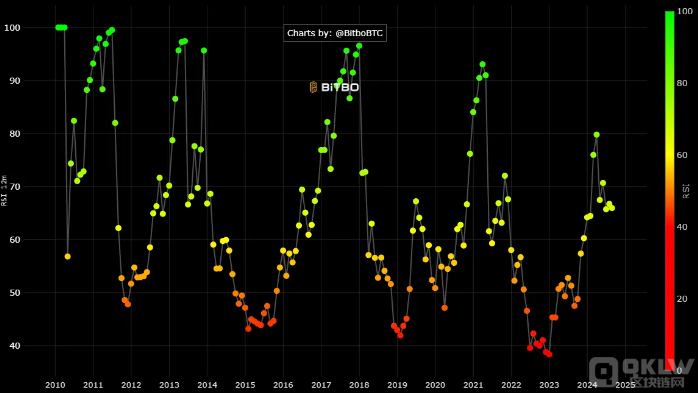 根據(jù)Bitbo數(shù)據(jù),Bitcoin的RSI指數(shù)為66.11。今年3月,BitcoinATH達(dá)到73,679美元時(shí),RSI飆升至79.79。