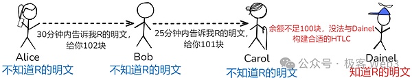 Carol如法炮制,在和Daniel的通道中創建HTLC:Carol愿意支付100塊,但Daniel要在20分鐘內告訴她R的明文,否則錢會被Carol收回。