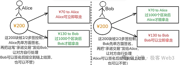 這筆承諾交易由Bob構造,然后發給Alice讓對方自行處理。如圖所示,這就是一筆Bitcoin轉賬,聲明把多簽賬戶中70塊錢給Alice,130塊錢給Bob,但錢的解鎖條件“不對稱”,Alice面對的限制更苛刻,對Bob更有利。