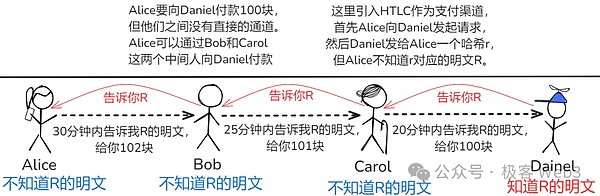 之后的事情不難想象:Carol把密鑰R告訴Bob,拿到101塊錢;Bob再把密鑰R告訴Alice,拿到102塊錢。我們觀測所有人的得失,可以看出Alice失去102塊錢,Bob和Carol凈賺1塊錢,Daniel得到100塊。這里面Bob和Carol賺的1塊錢就是它們從Alice那抽的手續費。