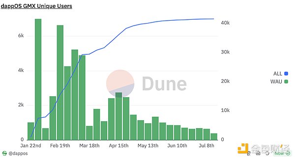 在2023年1月,dappOS與永續合約平臺GMX達成合作,推出前端gmx.dappOS.com。GMX用戶使用dappOS可以進一步簡化交易流程,同時可以降低20%的費用支出,并且允許用戶使用任何Tokens來支付費用。在今年的1月-3月周活躍用戶一度超過6000,最近一段時間也保持1000左右的周活躍用戶。同時獲得了近1.5億美元的交易量,高峰時期日交易量超過1000萬美金。