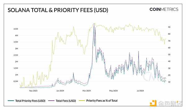 受整體市場和memecoin飆升的推動(dòng),Solana的總費(fèi)用在3月份達(dá)到了450萬美元的峰值。此時(shí),優(yōu)先費(fèi)用占總費(fèi)用的95%(自8月以來,這一數(shù)字一直保持在80%左右),代表著對交易納入的高需求。然而,活動(dòng)已顯著減少,目前總費(fèi)用為73.2萬美元,優(yōu)先費(fèi)用為53.3萬美元。采用和使用特征