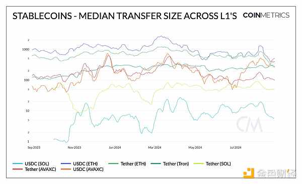 這一趨勢也反映在上圖中,該圖顯示了各主要穩(wěn)定幣(USDC和USDT)在第1層上的中位轉(zhuǎn)賬規(guī)模。Ethereum上的USDC和USDT通常都顯示出較高的中位轉(zhuǎn)賬規(guī)模——盡管最近分別降至400美元和267美元——這得益于Ethereum主網(wǎng)費(fèi)用的降低。Tron上的Tether一直保持在270美元的典型規(guī)模,而Solana的穩(wěn)定幣轉(zhuǎn)賬價(jià)值最低(USDC為7美元)和(USDT為50美元)。
