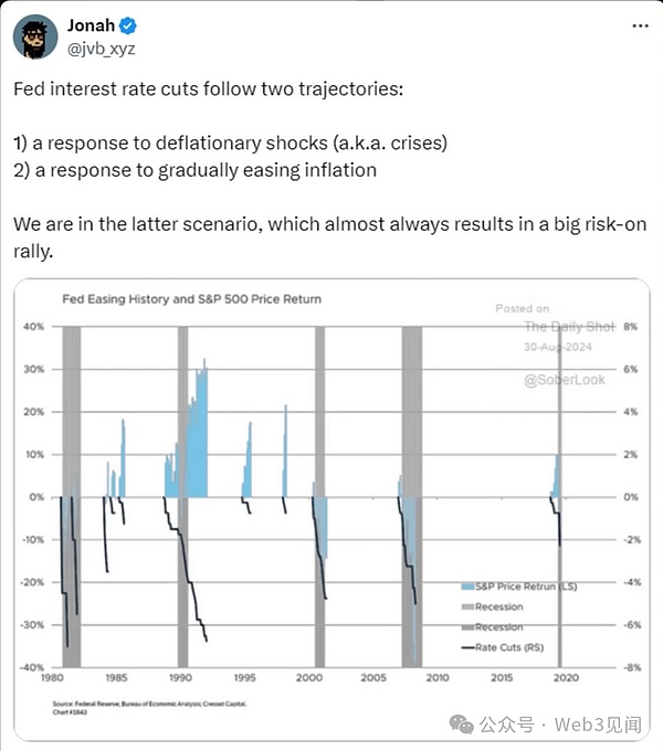 現(xiàn)在,美聯(lián)儲(chǔ)通常會(huì)出于兩種原因之一降息:應(yīng)對(duì)通貨緊縮沖擊或應(yīng)對(duì)逐步緩解的通脹。從歷史上看,第二種情況幾乎總是會(huì)導(dǎo)致大幅風(fēng)險(xiǎn)偏好反彈,即股票或Crypto等風(fēng)險(xiǎn)市場(chǎng)出現(xiàn)反彈。