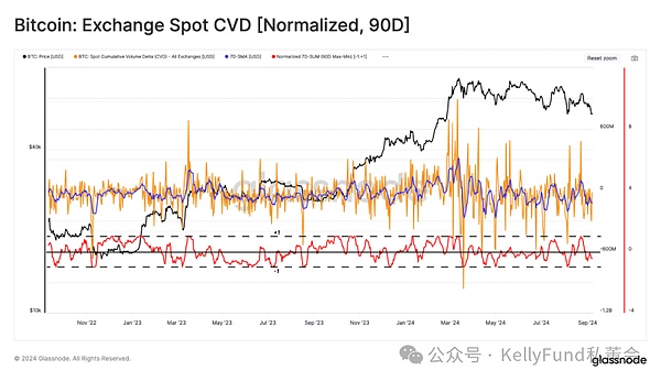 接下來,我們將研究交易所的現貨交易量。在這里,我們著重關注90日MinMax標量,該標量標準化研究特定時間段內,交易量極值的+1/-1標準差范圍內的波動情況。
