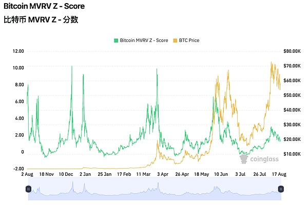 從上圖2010年-2024年數據中我們可以看出,相比之前周期,MVRV-Z分數(綠色線)波動、峰值和回報相對溫和,并不像早期那般幅度大。