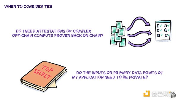 TEE并無(wú)這些限制。雖然TEE的速度比普通處理器慢,但它們?nèi)匀槐菳lockchain快上幾個(gè)數(shù)量級(jí)。此外,TEE本身具有隱私保護(hù)功能,默認(rèn)情況下會(huì)對(duì)所有處理過(guò)的數(shù)據(jù)進(jìn)行加密。