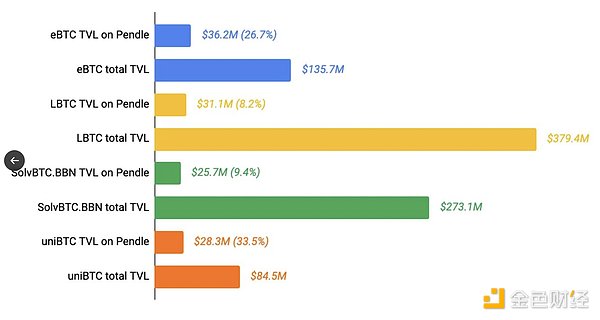 近期,Pendle已陸續(xù)將四種BTCLST集成到其積分市場(chǎng)中,包括$LBTC、$eBTC、$uniBTC和$SolvBTC.BBN。當(dāng)前各LST在Pendle上的流動(dòng)性和總TVL情況如圖所示。其中,$LBTC的實(shí)際采用情況高于LBTC(Corn)池中的表面數(shù)值。由于37%的$eBTC由$LBTC支持,Pendle對(duì)$eBTC的集成也會(huì)讓Lombard間接受益,從而使$LBTC持有者擁有更多優(yōu)化收益策略的機(jī)會(huì)。