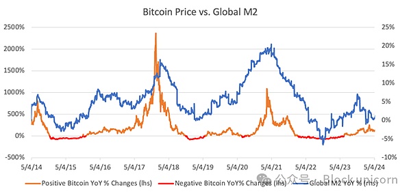 下圖清楚地顯示了Bitcoin價格如何追蹤全球流動性的變化。