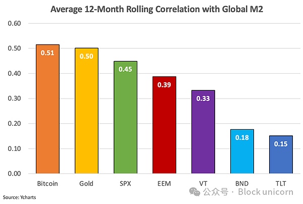 從12個月的滾動相關性來看,Bitcoin與全球流動性的平均相關性下降至0.51。這仍然是一個中等偏正的關系,但顯著低于整體相關性。