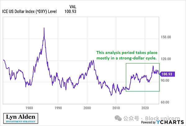 美元計價之所以重要,是因為美元是全球儲備貨幣,因此是全球貿易、全球合同和全球債務的主要記賬單位。當美元走強時,各國的債務就會變硬。當美元走弱時,各國的債務就會變軟。以美元計價的全球廣義貨幣就像是衡量世界流動性的一項重要指標。法定貨幣單位的創造速度有多快?美元相對于全球其他貨幣市場有多強勢?