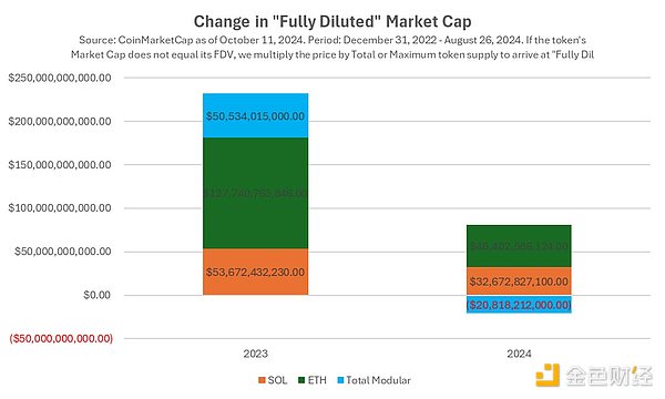 然而,2024年的情況并非如此。SOL和ETH繼續(xù)增長(盡管增長幅度不大),而模塊化Blockchain的市值卻在整體下降。這可能是市場在2024年對Ethereum模塊化戰(zhàn)略的價值失去了信心,也可能是來自Tokens解鎖的壓力,當(dāng)然,還可能是市場對購買一籃子Tokens做多Ethereum相關(guān)基礎(chǔ)設(shè)施的心理成本不堪重負(fù),相比之下,他們只需購買一個Tokens就可以做多Solana技術(shù)生態(tài)。
