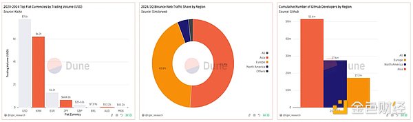 其次,亞洲在交易活動方面表現出色:2024年初,韓國基于韓元的交易量超過了美元交易量,最近一半以上的BN網站流量也來自亞洲。