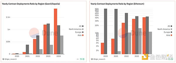 亞洲開發者在智能合約開發中的參與度不斷增加。來自Ethereum主網和測試網(Goerli和Sepolia)的鏈上數據證實了這一趨勢。
