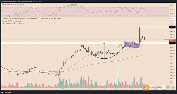 杯柄突破通常會投射出與杯深度相等的測量移動,使得以太幣的上行目標接近3,940美元。
