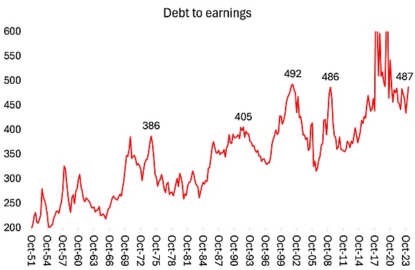 而且這種泡沫的支撐非常薄弱。美國股市推動著世界股市,而推動美國股市的只有七只股票:即所謂的七大股票。對于絕大多數美國公司而言,除了蓬勃發展的能源行業、社交媒體和科技行業之外,情況并不樂觀。標普500指數成分股公司的每股自由現金流三年來沒有增長(見下圖紅線)。利潤增長預測與實際增長情況大相徑庭。