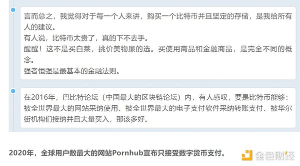 BTC的價值,從產(chǎn)業(yè)維度來說,我想分成宏觀、中觀和微觀三個層面再談?wù)劇:暧^來看,BTC代表著人類整個金融市場的避險預(yù)期,以及人類歷史上繼債券、股票后第三種可以資本化的「金融介質(zhì)」;中觀來看,BTC是未來人類所必然進(jìn)入的「數(shù)字時代」也就是web3世界產(chǎn)值最好的「指數(shù)」;微觀來看,BTC在合規(guī)監(jiān)管方面逐漸健全,將在美國等主流國家吸引大量「傳統(tǒng)老錢」。在第三世界國家,則虹吸了本土無法被滿足的民間投資需求。