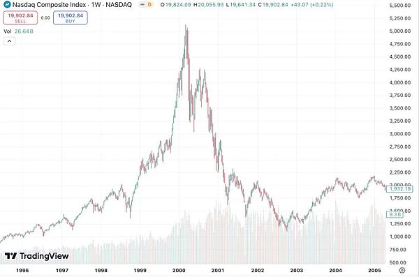 以及,回看當年波起云涌,也被眾多媒體詬病“泡沫”的互聯(lián)網(wǎng)行業(yè)。今天,納斯達克指數(shù)突破了20000點大關。回過頭看,2000年的它,當時看似山峰,現(xiàn)在,不過是一個小山包罷了。就算在2000年躬身入局互聯(lián)網(wǎng)行業(yè),堅持到今天,依然幾乎是最正確的選擇。
