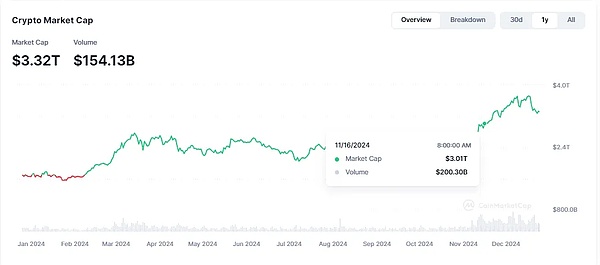 在Crypto市場中,自2018年以來,錨定美元的穩定幣發揮了關鍵作用。它們不僅是交易的基準貨幣單位,也充當了影子美元資產的角色,活躍于轉賬支付等多個場景。以鏈上日均轉賬量為例,當前的日轉賬量穩定在250億至300億美元的高位區間,即便在市場低迷時期,該數據也未低于100億美元。在交易量方面,根據CCData的報告,2024年11月CEX的穩定幣月度交易量高達1.8萬億美元,超出了Crypto行業總市值的一半。結合CoinMarketCap的行業數據,我們可以估算11月的日均交易量為2000億美元,即月度交易量達6萬億美元,這意味著穩定幣在中心化交易量中占據了行業交易量的30%。這一比例還未包括鏈上穩定幣交易量,亦即其實際占比可能更高。除了交易量和轉賬量這兩個核心指標外,穩定幣也通過引入如美國國債等穩定收益的資產作為底層資產,提供穩定可持續的收益,為行業帶來了正外部性,進一步促進了Web3與現實的連通和融合。