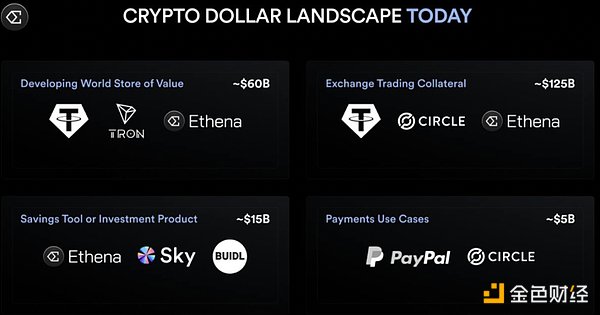 儲蓄工具或投資產品:目前由Ethena和Sky主導,幾乎沒有傳統金融體系對鏈上產品的參與,市場規模約為150億美元。