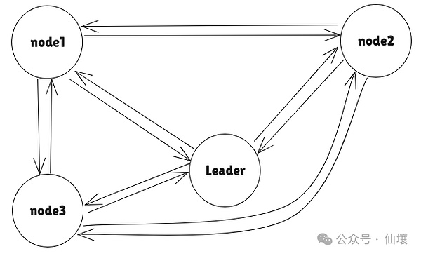 下圖展示了在非并行情況下的HyperBFT共識的消息傳遞方式,可以看到,所有的消息被Leader匯總并統(tǒng)一廣播,免去了節(jié)點之間自行交換消息的步驟,大幅降低了復雜度。