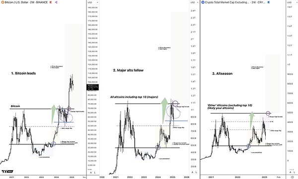 Bitcoin→主要山寨→高市值Tokens→中市值Tokens→低市值Tokens