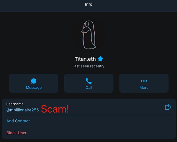 我們進一步調查發現,騙子在 Telegram上盜用了知名鏈上偵探ZachXBT的頭像。