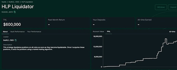 協(xié)議的核心流動性是HLPVault,一個結(jié)合做市商與清算人的混合金庫,占據(jù)TVL的90%以上