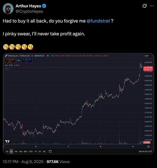 同月早些時候,他以宏觀經濟擔憂為由,在Ethereum價格接近3500美元時賣出了832萬美元的Ethereum。當ETH反彈至4150美元以上時,他重新買回,并在社交媒體上承認:“不得不全部買回來。我發誓,我再也不會獲利了結了!