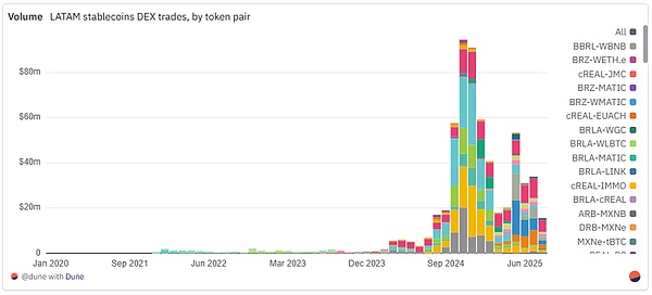 BRLA正成為兌美元主通道,BRLA–USDC(9,750萬美元)與BRLA–USDT(2,130萬美元)為核心交易對。自2025年3月起,BRLA–USDC幾乎一直位列數(shù)據(jù)集中最大的USD計(jì)價(jià)交易對(僅5月被MXNB交易對短暫超越)。BRLA雖未觸及cREAL峰值,但2025年7月交易對總成交900萬美元,幾乎是當(dāng)月cREAL的兩倍,為自身2024年7月的三倍。